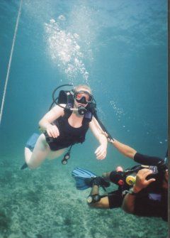 Bre is lead to the bottom by the dive master. Earlier in the day, she completed her training in the onshore pool.