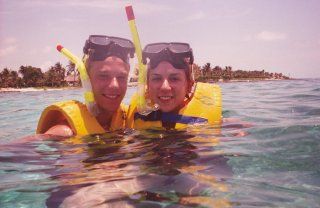 Bethany and Ian snorkeling during the jungle cruise trip which was taken by the entire group. You can see the coast of the Mayan Riviera in the background. We were able to snorkel in a protected coral reef habitate that was filled with hundreds if not thousands of fish swimming many times in large groups.